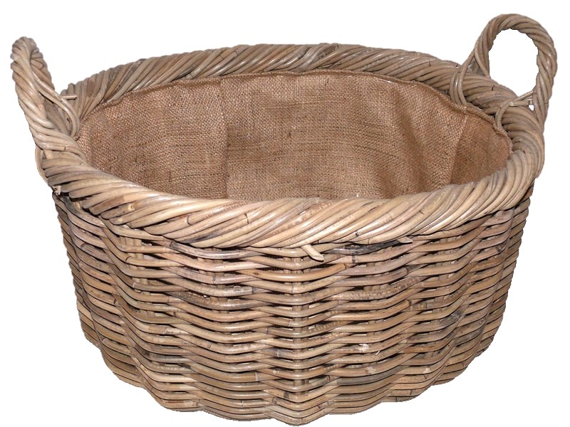 Pevný koš na dřevo upletený z ratanu, uvnitř pošitý jutou, s dvěma uchy. Barva šedá.